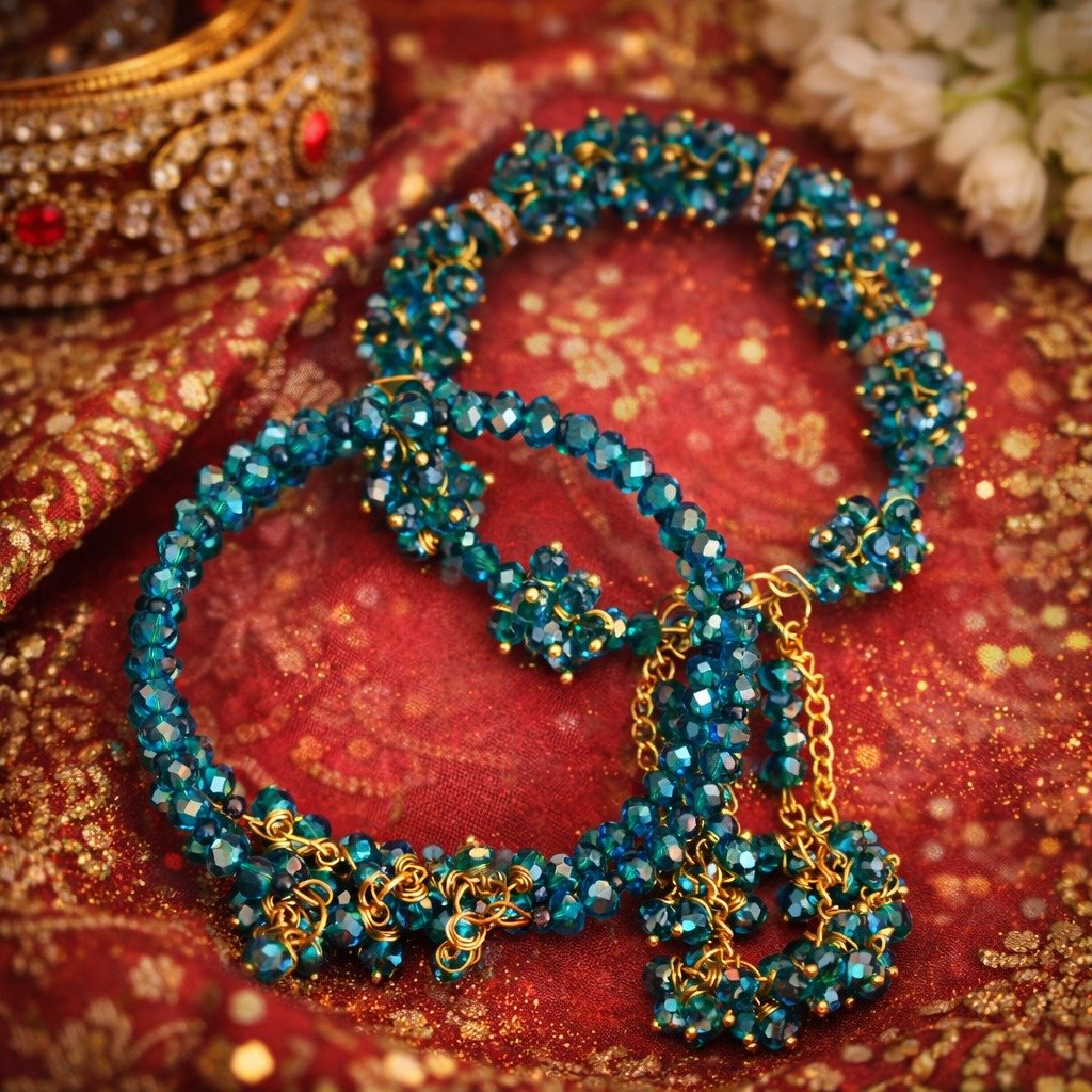 This stunning bangle pair is made with high-quality teal/emerald green crystal beads, detailed beadwork clusters, and elegant gold-tone latkan chains that create a luxurious and eye-catching finish.