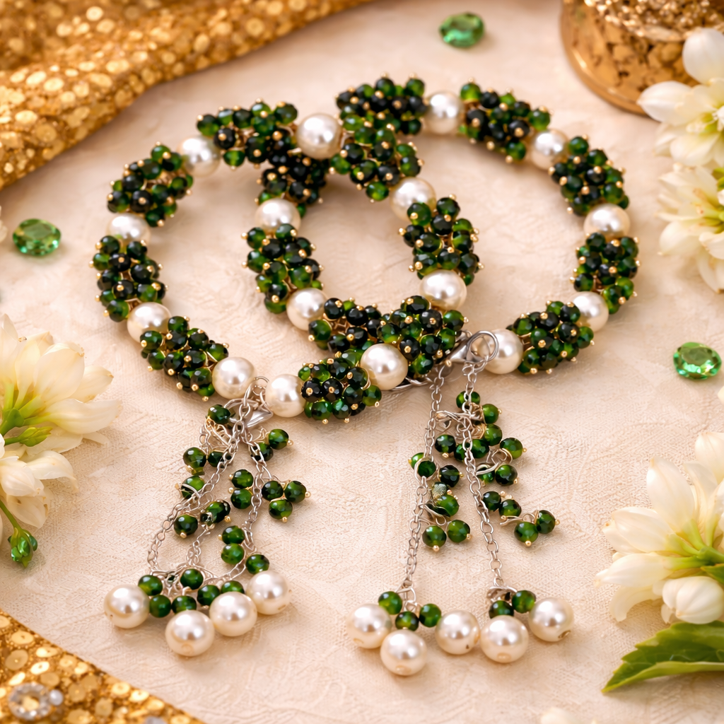 This stunning bangle pair is designed using high-quality green crystal beads, classic pearls, and beautiful hanging latkan chains that create a rich and festive appearance.