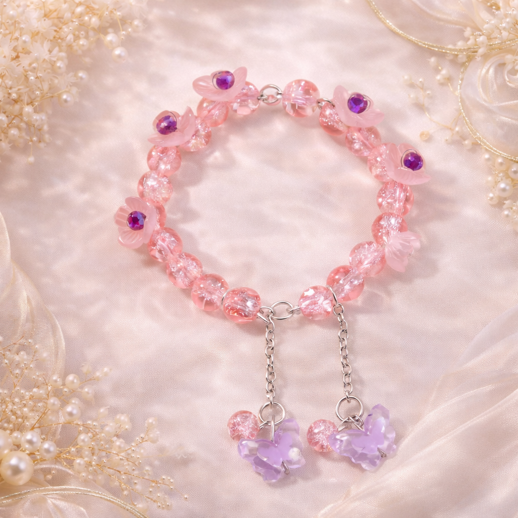 Introducing our elegant Pink Beaded Bracelet for Girls, exclusively handcrafted by Sawi Jewellery. This charming bracelet features soft pink crackle glass beads paired with delicate flower details and hanging butterfly charms, creating a graceful and feminine look.