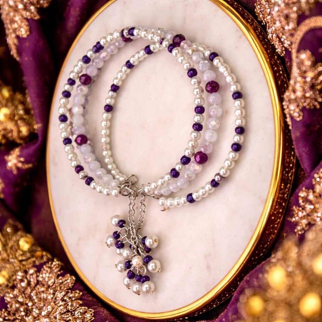 Add a royal touch to your festive and bridal look with our Handmade Purple Pearl Bangles, exclusively crafted by Sawi Jewellery. This stunning bangle pair is designed using high-quality white pearls, rich purple crystal beads, and elegant hanging latkan chains for a luxurious and eye-catching finish.